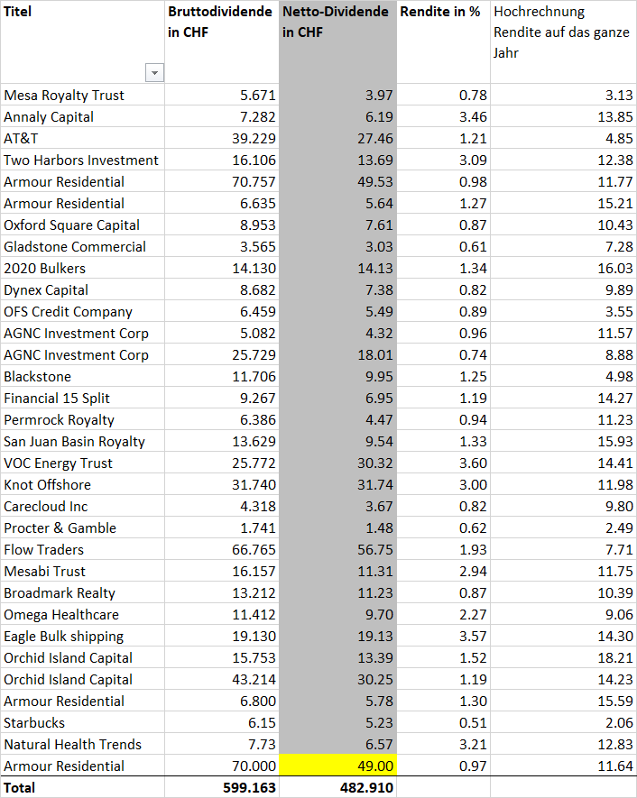 Hier noch ein Monats-Vergleich der Dividenden des Jahres 2021 und 2022. Da ich im Jahr 2021 noch keine ausländischen Aktien besass, gab es im selben Monat letztes Jahr keine Dividenden.